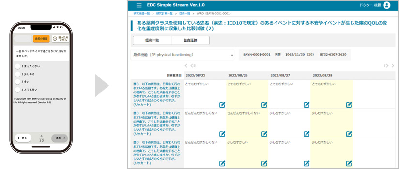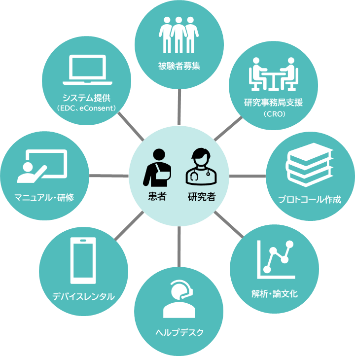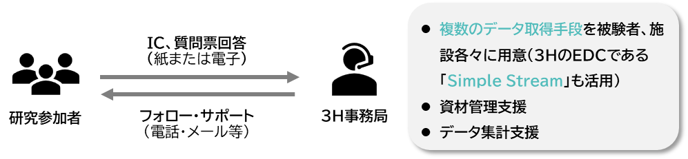 3HのePRO研究トータルサポート ePROシステムの提供にとどまらず、研究参加者の募集から解析まで研究プロジェクトを全体をトータルサポートいたしますもちろん、各サービス単体でのご依頼も可能です ePRO研究で被験者募集から解析までをトータルサポートした事例 研究概要 直面した課題 希少疾患患者さんを対象に、健康関連QOLと生活負担の季節変動を評価する1年間の前向き観察研究。 医療機関を介さず、患者さんから直接データを収集する 「サイトレス」形式で実施 研究実施のノウハウ不足 医療機関に紐づかない患者を対象とする研究の進め方に不安があった。 長期参加への懸念 季節ごとに回答してもらうアンケートであるため、忘れることなく最後まで参加してもらえるか懸念があった。 サイトレスでの研究実施体制の構築とヘルプデスクによる 能動的なリマインドを提案 実施フロー サイトレス体制、ePRO、被験者リクルートでの経験から追記内容を提案し、作成を支援 アドバイザーの先生、患者会経由でリクルート、健常者は3Hを活用 同意取得専用Webサイトを構築し、同サイト上で説明動画を活用した同意取得を実施 版権元との交渉および契約(海外含む)を支援し、指標・配信の設定も実施 ePROでの事前連絡/未回答アラートとヘルプデスクからの未回答者フォローを実施 データマネジメント及び解析までをサポート サイトレス体制、ePRO、被験者リクルートでの経験から追記内容を提案し、作成を支援 アドバイザーの先生、患者会経由でリクルート、健常者は3Hを活用 同意取得専用Webサイトを構築し、同サイト上で説明動画を活用した同意取得を実施 版権元との交渉および契約(海外含む)を支援し、指標・配信の設定も実施 ePROでの事前連絡/未回答アラートとヘルプデスクからの未回答者フォローを実施 データマネジメント及び解析までをサポート ePRO回答率95%を達成 ePROと紙を併用した臨床研究をサポート 研究概要 直面した課題 COVID-19の長期合併症の実態把握と病態生理解明に向けた基盤研究 【対象】新型コロナウイルス感染患者2,000名(32施設) 【評価】 新型コロナウイルス肺炎の長期合併症の頻度 多数の施設での早期開始 32施設という多くの施設で、一日でも早く研究をスタートさせる必要があった。 長期間の協力維持 幅広い年齢層の患者さんから、4年間にわたり協力し続けてもらう必要があった。 ナレッジ不足 研究者側に大規模調査のナレッジがなく、3Hが全体を主導する必要があった。 医療機関に負担をかけない環境整備 と複数のデータ取得手段を提案 19件の論文公開 Terai H, et al. Comprehensive analysis of long COVID in a Japanese nationwide prospective cohort study. Respir Investig. 2023;61(6):802-814. Yagi K, et al. Impact of long COVID on the health-related quality of life of Japanese patients: A prospective nationwide cohort study. Respir Investig. 2025;63(4):610-616. Shigematsu L, et al. Social impact of brain fog and analysis of risk factors: Long COVID in Japanese population. Ann Clin Transl Neurol. 2024;11(8):2188-2200. Yagi K, et al. Clinical features of Japanese patients with gastrointestinal long-COVID symptoms. JGH Open. 2023;7(12):998-1002. Okada M, et al. Upper Respiratory Symptoms as Long COVID: Insight from a Multicenter Cohort Study. OTO Open. 2024;8(1):e120. Takaoka H, et al. Long COVID among the first three waves of COVID-19 in Japan: a multicentre cohort study. BMJ Open Respir Res. 2024;11(1):e002137. Nakagawara K, et al. Comprehensive and long-term surveys of COVID-19 sequelae in Japan, an ambidirectional multicentre cohort study: study protocol. BMJ Open Respir Res. 2021;8(1):e001015. Sunata K, et al. Asthma is a risk factor for general fatigue of long COVID in Japanese nation-wide cohort study. Allergol Int. 2024;73(2):206-213. EDC System 「Simple Stream」 3H P-Guardianと連携が可能なEDCシステム「Simple Strem」 コードレス設定とePROとのタイムリーデータ連携が特徴 <実装機能> クエリー機能、DM、モニターレビュー機能、PIによる署名機能、 監査証跡機能、症例データ出力(CSV形式) ノーコードのパッケージシステムであるため、要件確定後すぐに導入することが可能です 弊社ePRO「3H P-Guardian」とスムーズに連携できます他社製ePROとの連携も可能です(追加の開発が必要となります) ePRO研究トータルサポート実績